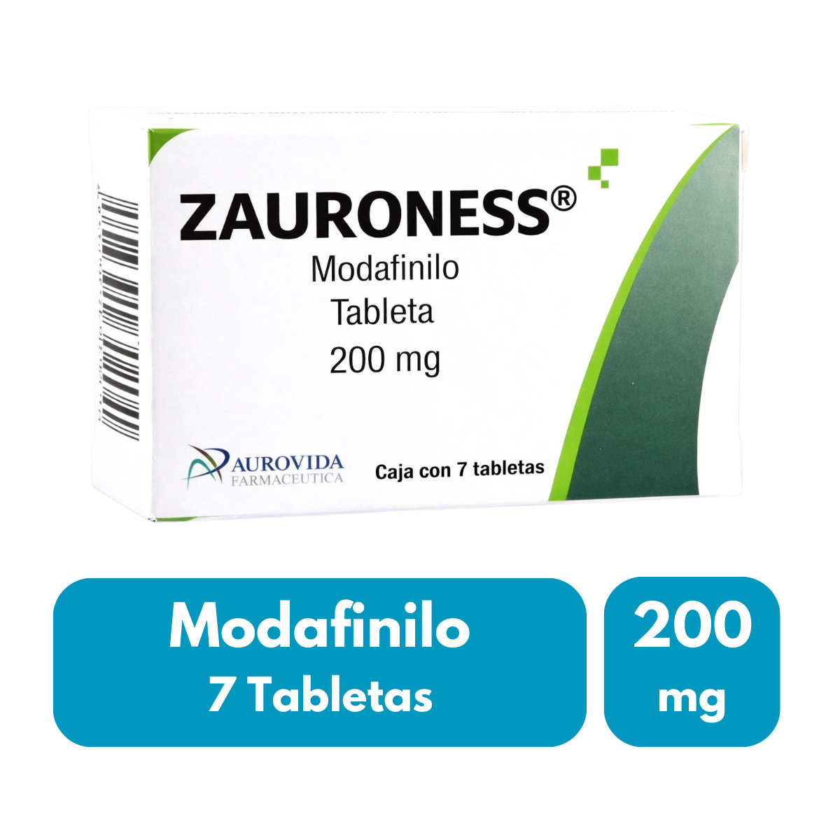 Presentación con 7 tabletas, elaboradas por Aurovida bajo la marca Zauroness. Cada tableta contiene 200 mg de modafinilo, formulada bajo estándares de calidad farmacéutica. Producto de uso especializado, perteneciente a la línea de cuidado del sistema nervioso, respaldado por un laboratorio con experiencia en el sector.